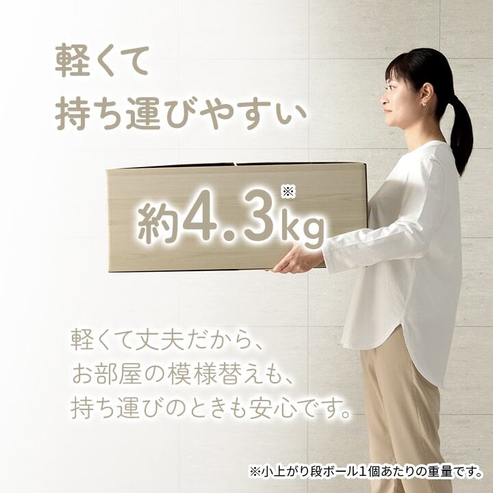 組み立て式のダンボール製小上がりと置き畳のセット商品で簡単にお部屋に小上がり和室がつくれます。小上がりは軽量な段ボール製です(小上がりだけで1個、約4.3Kg)。段ボール製で軽いので楽に移動ができ、簡単に模様替えができます。組み立て式なので使わなくなったり引っ越しする際も容易に解体できてコンパクトに収納したり持ち運べて便利です。段ボール製で廃棄も簡単です。再利用が可能なのでとてもエコな商品です。なつかしい畳の香りと肌ざわりを手軽に楽しめます。い草には空気の自然浄化作用、湿度の調節作用などがあります。置き畳の中材は木製ボードタイプ+ポリエチレンで程よいクッション性と重量感があります。