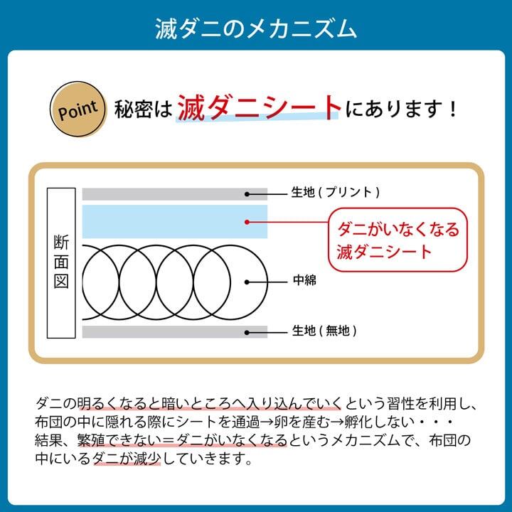 ダニ0(ZERO)への挑戦! 毎日使うお布団、少しでも「清潔」かつ「気持ち良く」使いたい方へ、そんなご要望にお応えできる商品を開発しました。ダニ増殖抑制99%を実現する特殊滅ダニシートを使用しています。安心の国内生産です。表地には心地よい肌触りのピーチスキン加工の生地を使用しています。温かい空気を外に逃がしにくい様に、体にフィットし易い特殊なキルト縫製を施しています。