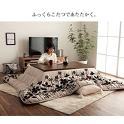 シンプルなリーフ柄をあしらった商品です。表地には肌触りやわらかなフランネルを使用しました。部分暖房のこたつは電気代もお得です。