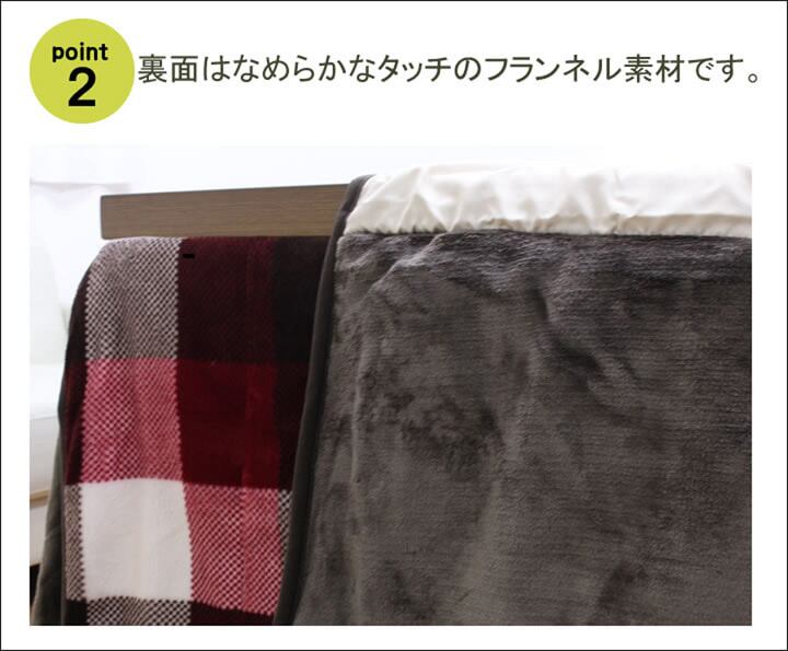 あたたかみのあるカラーと素材を使用したチェック柄のこたつ布団です。表地は糸を先に染色してから生地を織る技法を採用しておりますので、プリントものや後から染めるものとは違う上質な雰囲気があります。裏地にはなめらかな肌触りが特徴的なフランネルを使用しています。省スペースタイプで角が膨らまず、お部屋を広く使えます。薄手なので折りたたんでもかさばらず、コンパクトに収納できます。部分暖房のコタツは電気代もおトクです。