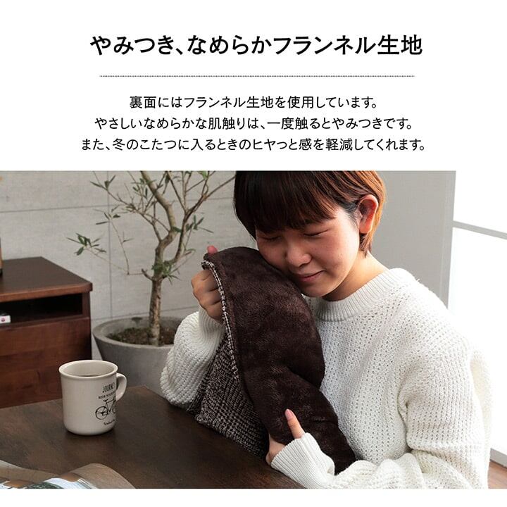 シンプルなデザインのこたつ布団です。表地にはツイード調の生地を使用しているため落ち着いた雰囲気のお部屋にぴったりです。裏地にはソフトな肌感触のフランネル生地を使用しています。薄手なのでかさばらず、コンパクトに収納できます。部分暖房のコタツは電気代もおトクです。