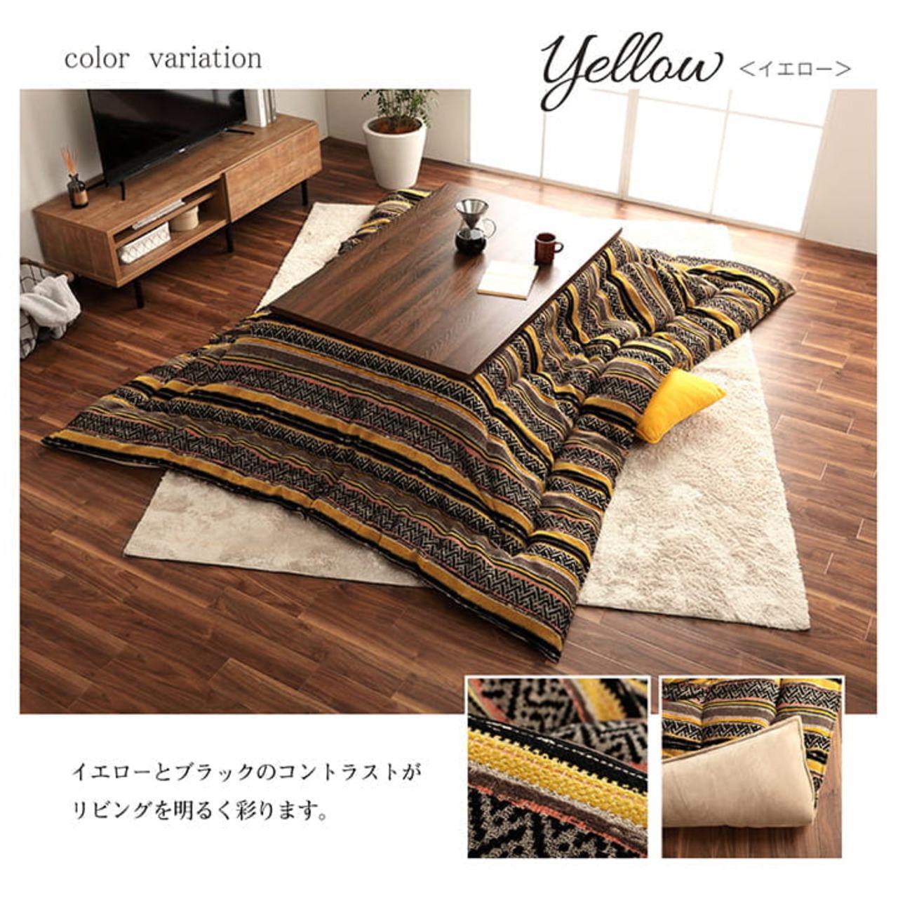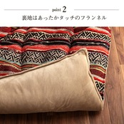 ストライプ調の中に幾何柄をデザインし、派手さと深みのあるこたつ布団。