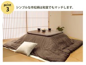 生地にインド綿を使用したこたつカバーです。シンプルモダンをテーマにデザインしておりますので、少し大人で素材感のあるお部屋のイメージにぴったりです。インド産の綿生地を使用しております。また、綿はポリエステルに比べ、冬場気になる静電気も起こりにくく、繊維の中でも特に肌触りがよいのが特徴です。
