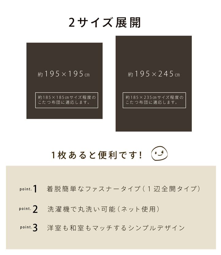 シンプルな無地のファスナー付きコタツ掛けカバーです。洗濯機で洗えるので清潔にご使用頂けます。