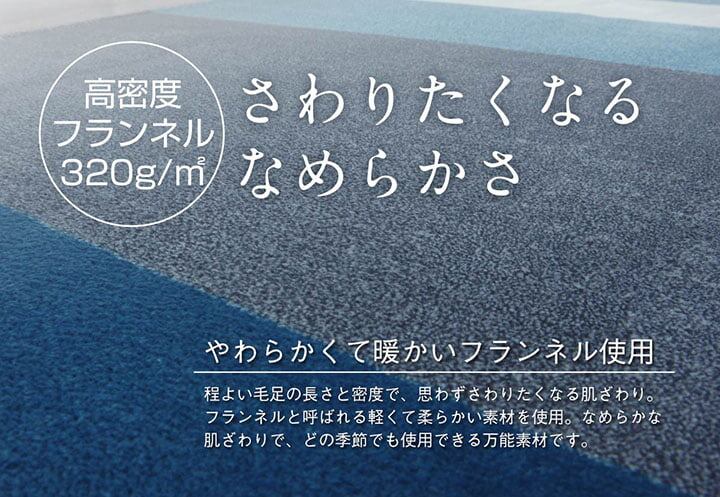 表地にはフランネルと呼ばれる、非常にやわらかいやさしい肌触りの生地を使用しています。電気カーペットカバーとしても使用できます。フローリングを傷つけにくいよう裏には不織布を貼っています。滑り止め付き。ホワイトのアクセントがお部屋にワンポイント添えます。