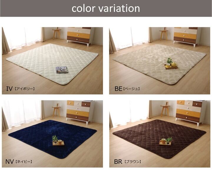 中わたに抗菌防臭加工を施した無地のキルトラグカーペットです。表地には柔らかく、肌触りの良いフランネル生地を使用してます。毛足が短いので掃除機もかけやすく、毛足にゴミや埃が絡みにくいという特長もあります。フローリングを傷つけにくいよう、裏には不織布を貼っています。またすべりにくい加工も施しておりますので、フローリングでも安心してご使用頂けます。中材にはウレタン10mmを使用しておりますので、適度なボリュームとクッション性があります。また、表地の素材が同じで同色のコタツ掛け布団も別途取扱いがありますので、トータルでのコーディネートもおすすめです。コタツ敷布団、ホットカーペットカバーにも適しています。床暖房にも対応しています。※本商品は圧縮梱包でのお届けとなります。商品が届きましたらお早めに開梱して頂き、2~3時間日陰干しをして頂くと復元が早まります。