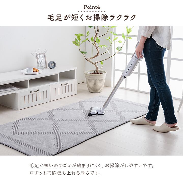 毛足が短いのでゴミが絡まりにくく、お掃除がしやすいです。ロボット掃除機も上れる厚さです。