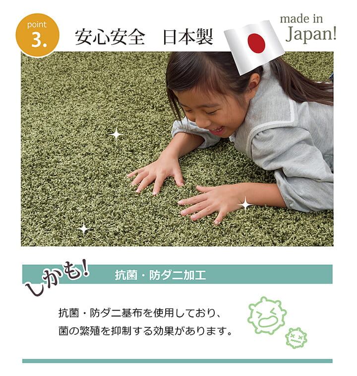 安心の日本製タフトシャギーラグです。多色多サイズ展開、お部屋に合わせてお選び下さい。基布と裏地を貼り合わせる接着剤に防炎の薬剤を混ぜて防炎加工を施しています。防炎性能を有する防炎品は火災の初期段階では火災の発生を抑止し、延焼拡大を抑制または阻止する効果があります。また、防炎効果により火災の成長を抑制抑制することで、初期消火や避難などの火災対応を行う貴重な時間的余裕をもたらします。基布には抗菌・防臭・防ダニ加工を施しておりますので、お子様にも安心です。パイル長約25mmのシャギータイプです。適度な長さでふかふかとした肌触りです。パイル部分にはフリーゼセット加工を施しており、くしゅくしゅっとした表面変化(立体感)とボリュームを出しています。また、若干の光沢をプラスするとことで、少し大人な高級感を出しました。ホットカーペット、床暖房対応でパイル部分もさらっとしていますのでべとつかず暑い時期にもご使用頂ける、オールシーズン仕様です。