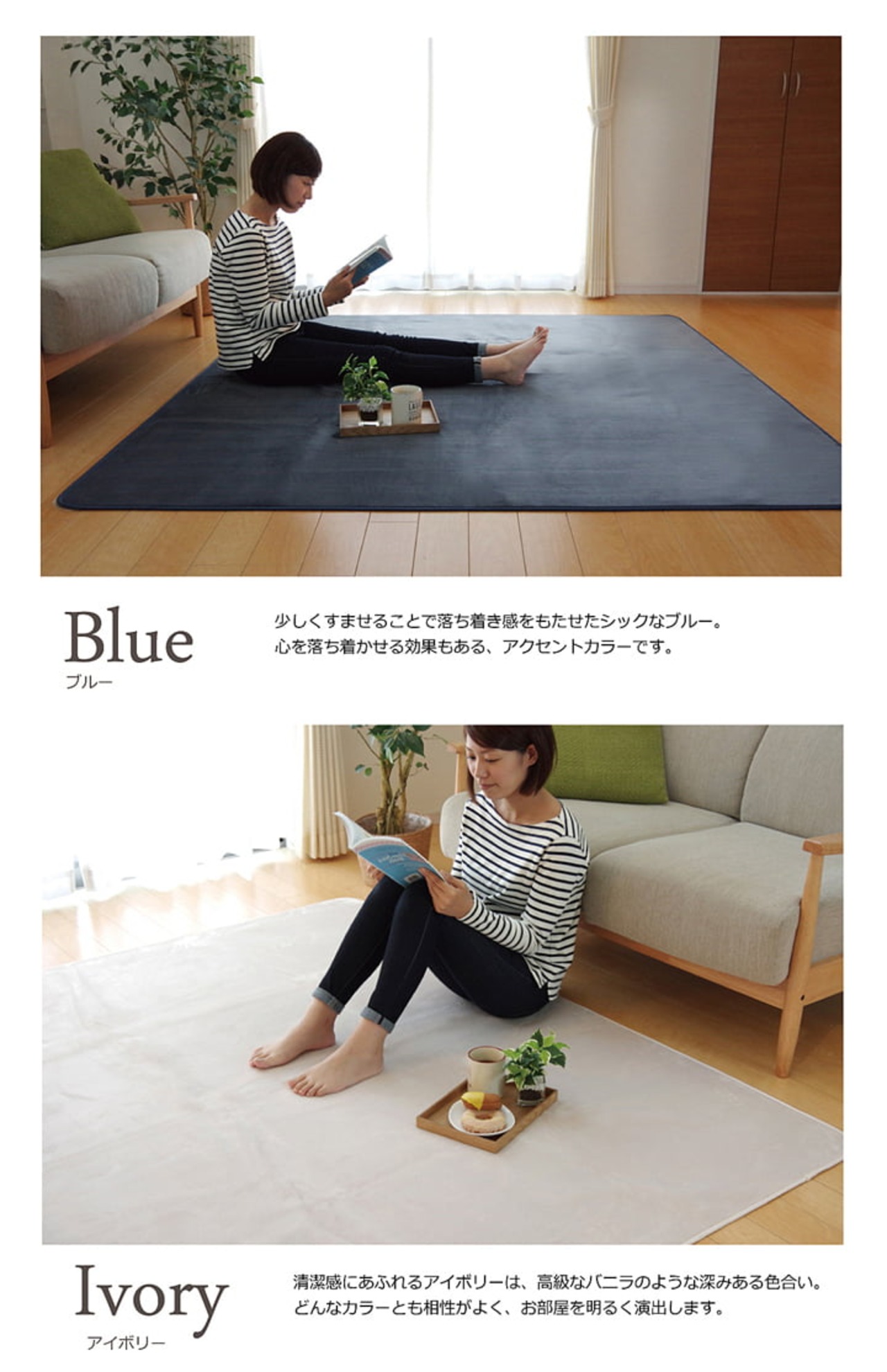 生地に抗菌・防臭加工を施した、ラグカーペットです。多色展開ですので、お部屋に合わせてお好きなカラーをお選び下さい。表地にはフランネルと呼ばれる、しっとりとして非常に柔らかい生地を使用しています。軽量で持ち運びが楽々です。薄手で小さく折りたたむことができますので、収納時にも場所を取りません。フローリングを傷つけにくいよう、裏には不織布を貼っています。ご家庭の洗濯機で洗えるウォッシャブル仕様ですので、清潔にご使用頂けます。電気カーペットカバーとしてもご使用頂けます。季節を選ばすオールシーズンご使用頂けます。多サイズ展開で、ワンルームから子ども部屋、リビング・ダイニング、ベッドサイド、ソファ前にも。いろいろなシーンに合わせてお選び下さい。