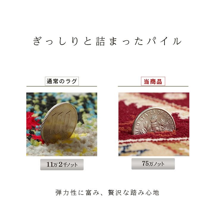 トルコ製の最高級ウィルトン織りカーペットです。ウィルトン織りは、非常に耐久性の高いカーペットです。家の中でも靴を履いて生活するヨーロッパで、土足で扱うことを前提として作られておりますので、長時間踏みつけてもヘタリにくく、弾力性もあり長くご使用頂けます。また、高密度にパイルを織り上げることで、耐久性プラス繊細な柄を表現できるのも特徴です。本商品の『繊維の密度を表すノット数』は75万ノットの最高級クラスです。ぎっしりとパイルが詰まっていますので弾力性に富み踏み心地もしっかりとしています。また、パイル数を多くすることにより、より繊細でより色鮮やかなメダリオン柄を表現しました。プリントものには出せない高級感・重厚感のある繊細な柄をお楽しみ下さい。本商品のパイル部分にはポリプロピレン素材を使用しております。ポリプロピレンはヘタリにくく、耐久性に優れ、繊維の中でも軽い素材です。また、汚れが付着しにくく、遊び毛や毛玉が非常に出にくいという特徴もあります。本商品にはヒートセット加工を施しております。ヒートセット加工をすることで、柔らかく、なめらかなタッチ感に仕上げました。ホットカーペットカバーや床暖房にも対応しております。安心して年間お使い頂けるカーペットです。