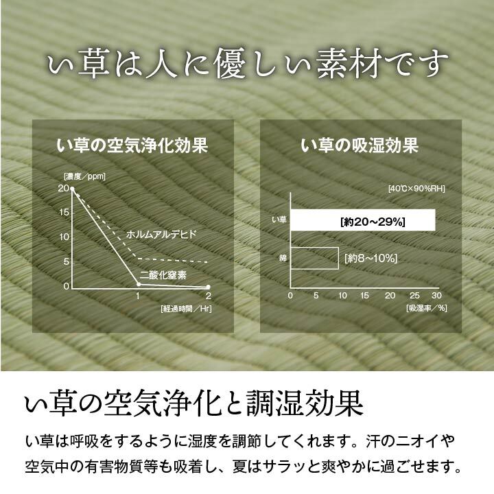 上質な国産い草をふんだんに使用したこだわりの上敷き。敷くだけで畳のお部屋をリフレッシュ出来ます。日焼けしてしまった畳のリフレッシュに、新品の畳を汚さないためのカバーにご使用下さい。長さ115〜120cmの国産(九州産)い草を使用しています。そのうち約87cmを使用しています。ヘリ際は多少白みを帯びます。(日焼けではありません、い草の根元と先端部分の色です。)い草は長いものほど高級になります。い草は先端部分が赤茶色く、根元が白く真中が青(緑)色です。真中の良質な青の部分を多く使用するほど、丈夫で綺麗な仕上がりとなります。またイ草は使用するうちに日焼けをしますが、真中の青の部分を多く使用したものほど、全体が綺麗にムラなく日焼けし、味が出ます。国産(九州産)のい草を使用しています。国産い草は一本一本が太く、表皮が厚く繊維がキメ細かいので弾力性があり、耐久性に優れています。い草には空気の清浄化作用、湿度の調節作用があり、汚れにくいといった特徴があります。い草に青森ヒバ加工を施しています。(抗菌、防臭効果)表裏の両面が使えて経済的です。