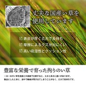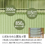 上質な国産い草をふんだんに使用したこだわりの上敷き。敷くだけで畳のお部屋をリフレッシュ出来ます。日焼けしてしまった畳のリフレッシュに、新品の畳を汚さないためのカバーにご使用下さい。長さ115〜120cmの国産(九州産)い草を使用しています。そのうち約87cmを使用しています。ヘリ際は多少白みを帯びます。(日焼けではありません、い草の根元と先端部分の色です。)い草は長いものほど高級になります。い草は先端部分が赤茶色く、根元が白く真中が青(緑)色です。真中の良質な青の部分を多く使用するほど、丈夫で綺麗な仕上がりとなります。またイ草は使用するうちに日焼けをしますが、真中の青の部分を多く使用したものほど、全体が綺麗にムラなく日焼けし、味が出ます。国産(九州産)のい草を使用しています。国産い草は一本一本が太く、表皮が厚く繊維がキメ細かいので弾力性があり、耐久性に優れています。い草には空気の清浄化作用、湿度の調節作用があり、汚れにくいといった特徴があります。い草に青森ヒバ加工を施しています。(抗菌、防臭効果)表裏の両面が使えて経済的です。