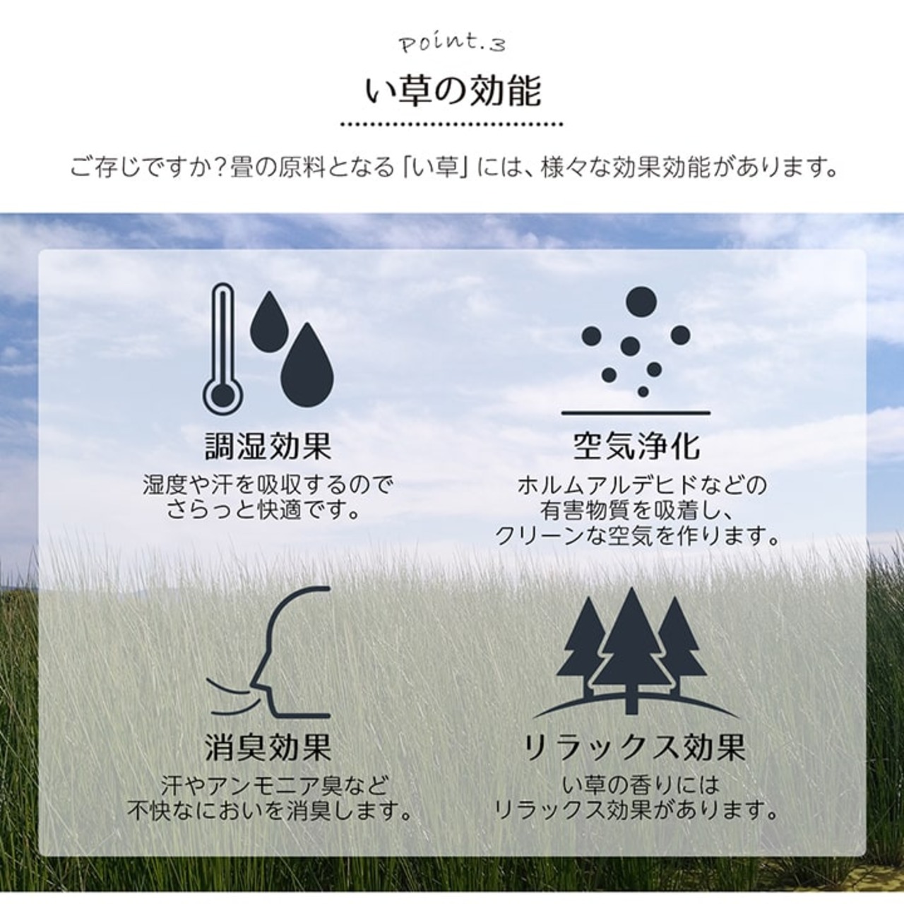 ギャベ柄で明るいデザインに仕上げたい草花ござカーペットです。 和室・洋室どちらにも合わせやすいデザインに仕上げました。和室には裏張り無しの商品、洋室には裏張り有りの商品がお勧めです。裏張り商品には裏面にフローリングを傷つけにくい不織布を使用しています。 天然素材のい草には、お部屋の空気をきれいにする空気清浄効果、お部屋の湿度を調整する調湿効果、汗臭、加齢臭、ペット臭などの嫌な臭いを消臭する消臭効果など優れた機能性があります。 青森県のヒバの木から抽出した「ヒバエッセンス」をメーカー独自の技術で生地表面に加工しました。ヒバエッセンスにはヒノキチオールという、天然物質としては極めて抗菌性の高い成分が含まれています。(無加工品に比べ、抗菌防臭効果があります。)