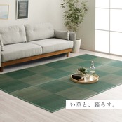 い草カーペットは和室の畳をカバーし、汚れや傷を防止してくれます。通常のカーペットと違い毛足が無いのでゴミや髪の毛などがからみにくく、掃除機やコロコロ(粘着シート)での掃除がラクにできます。い草には優れた消臭機能があり、汗臭やペット臭などの原因となる物質を消臭してくれます。い草には喘息の原因の一つとも言われる二酸化窒素や、シックハウス症候群の原因の一つのホルムアルデヒドを吸着してくれます。天然物質としては抗菌力の高い青森ヒバから抽出したヒノキチオールをい草生地に使用しており、抗菌防臭効果があります。い草の癒される香りとサラッとした肌触りはそのままに、和室や洋室にも合わせられるインテリア性の高いナチュラルシンプルなデザインで仕上げています。