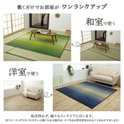 福岡県筑後地方の無形文化財「掛川織」の技法で織り上げた花ござです。掛川織は経糸の間隔に変化を付けた直線的な織り方で、上質な草だからこそ織れる格調の高さは特筆物。花ござの中でも特に高級品として重宝されてきました。大きな目と小さな目を交互に織り込んだ美しく洗練されたデザインが人気です。国産(九州産)のい草を使用しています。一本一本が太く、表皮が厚く繊維がキメ細かいので弾力性があり、耐久性に優れています。い草には空気の自然浄化作用、湿度の調節作用などがあります。青森産天然ヒバから抽出した植物由来成分で抗菌防臭加工をほどこしています。希少な国産い草を用いて、ベテラン職人が、長年の経験を活かし、国内工場で丹念に織りあげました。吸い込まれるような美しいグラデーションで草原と海を表現、まるで大自然の上にいるような雄大さを感じられます。